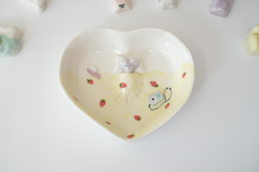 하트 모양 트레이 위 잠든 쥐돌이를 담은 잘자요 트레이입니다 ꕤ