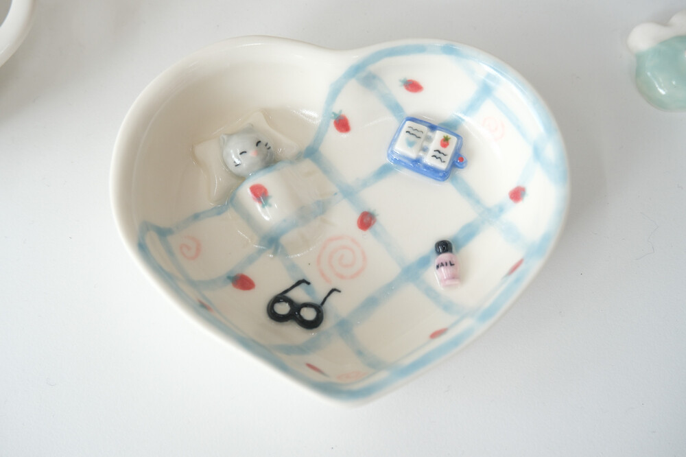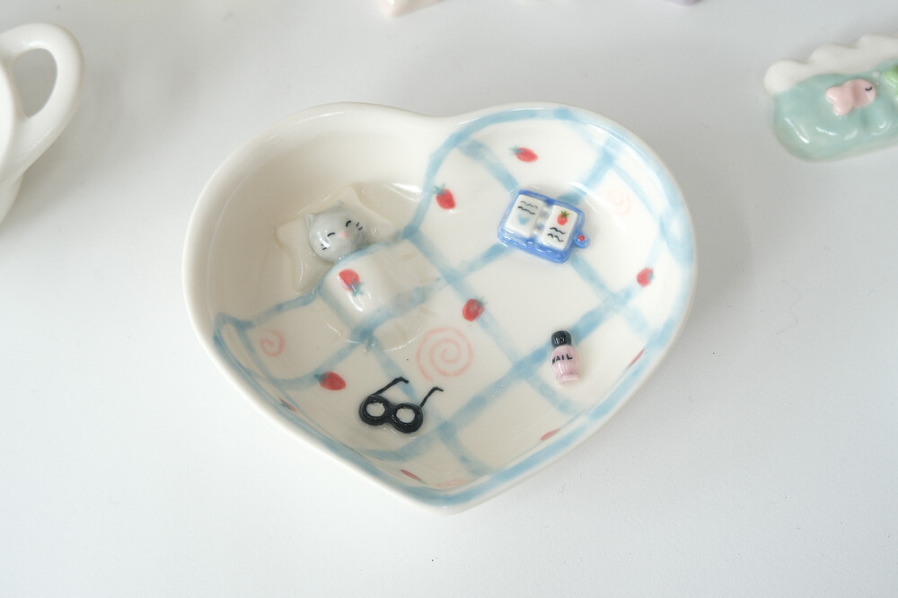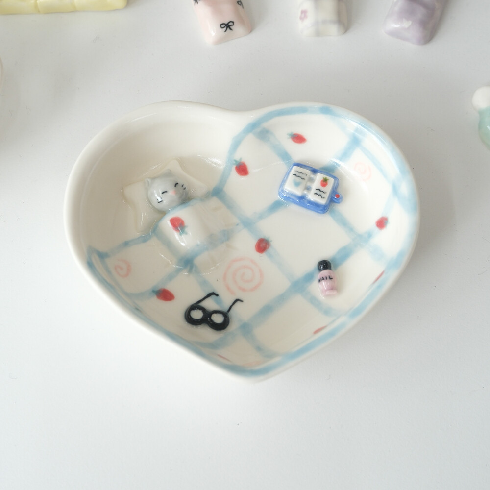 하트 모양 트레이 위 잠든 고양이를 담은 잘자요 트레이입니다 ꕤ