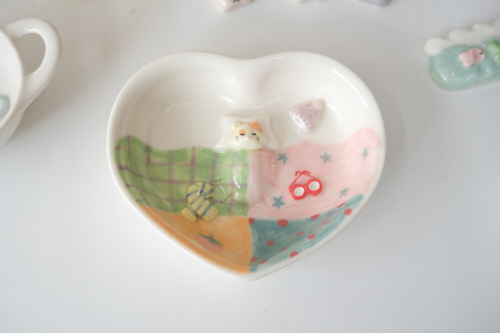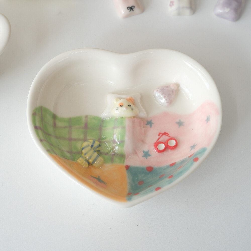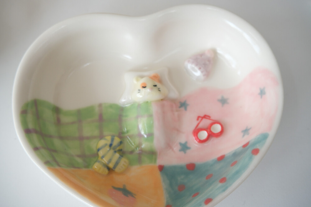 하트 모양 트레이 위 잠든 햄스터를 담은 잘자요 트레이입니다 ꕤ