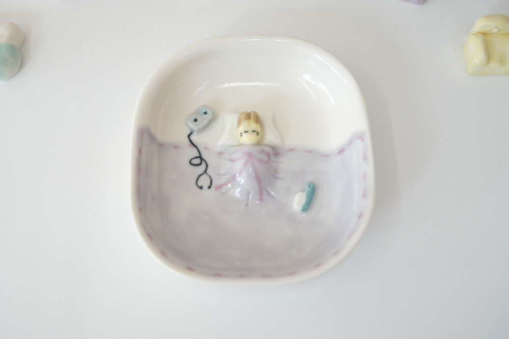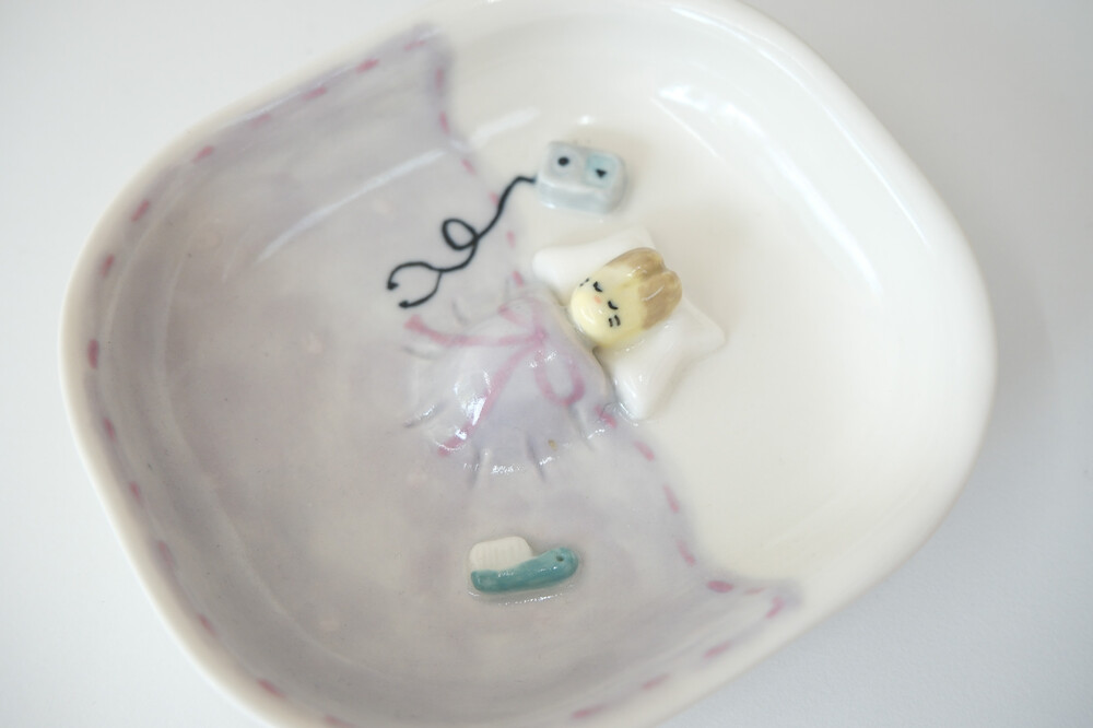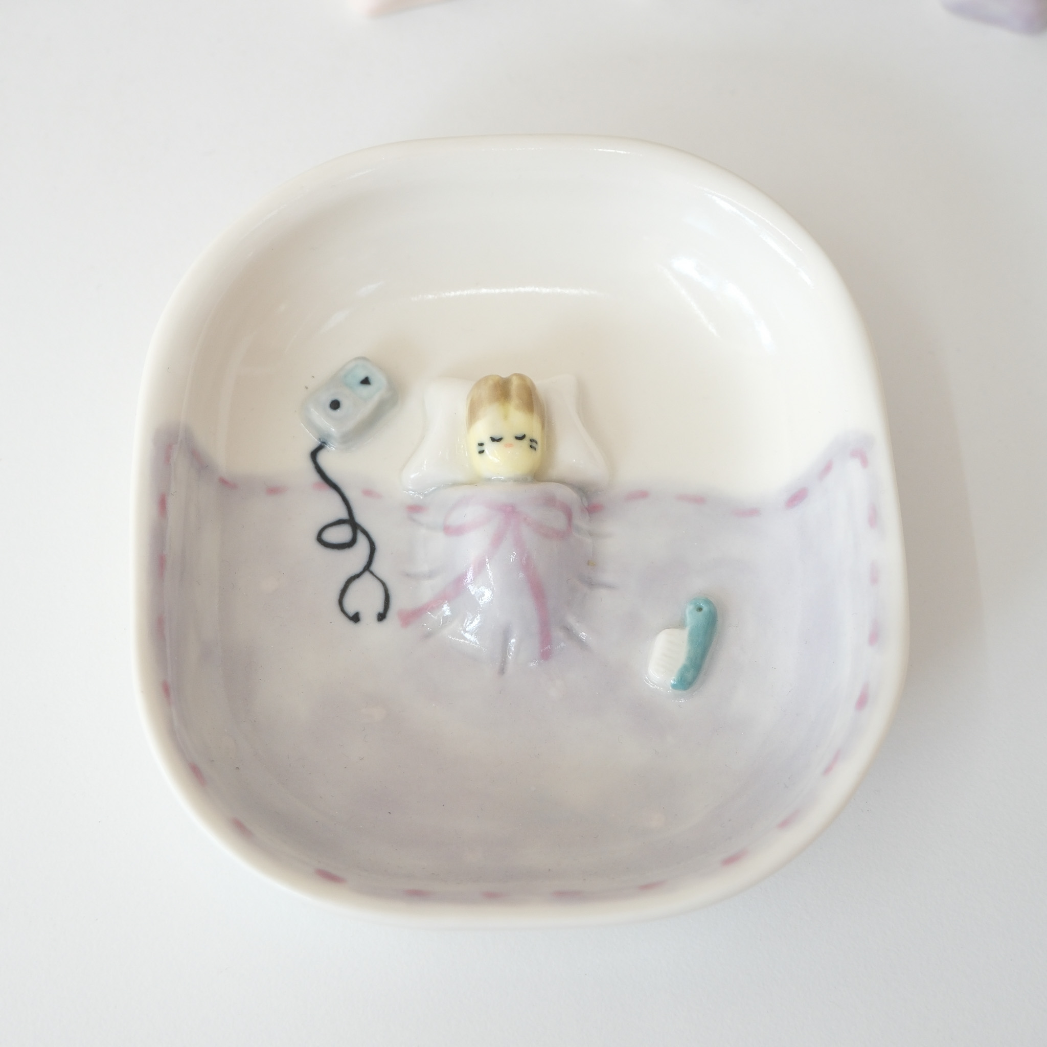 둥근 네모 모양 트레이 위 잠든 토끼를 담은 잘자요 트레이입니다 ꕤ