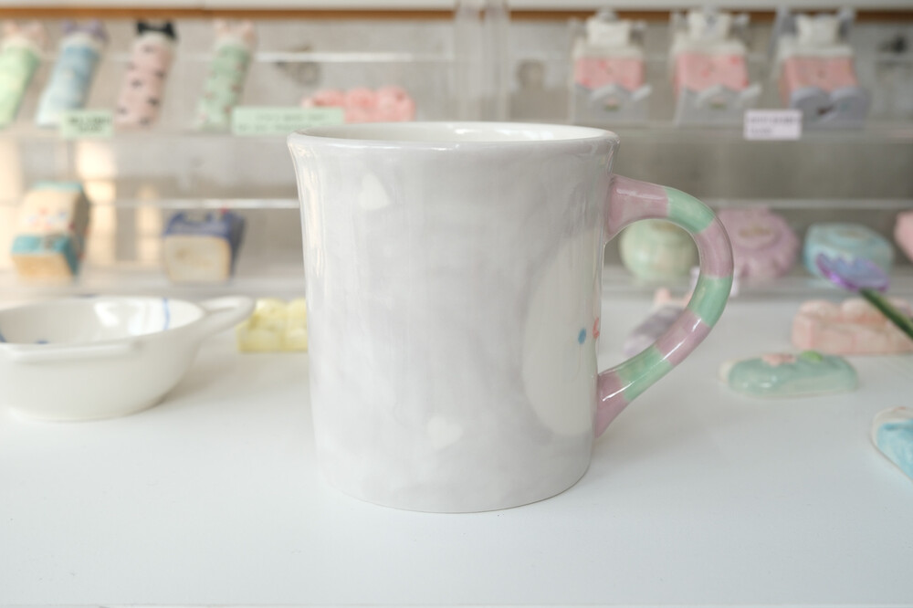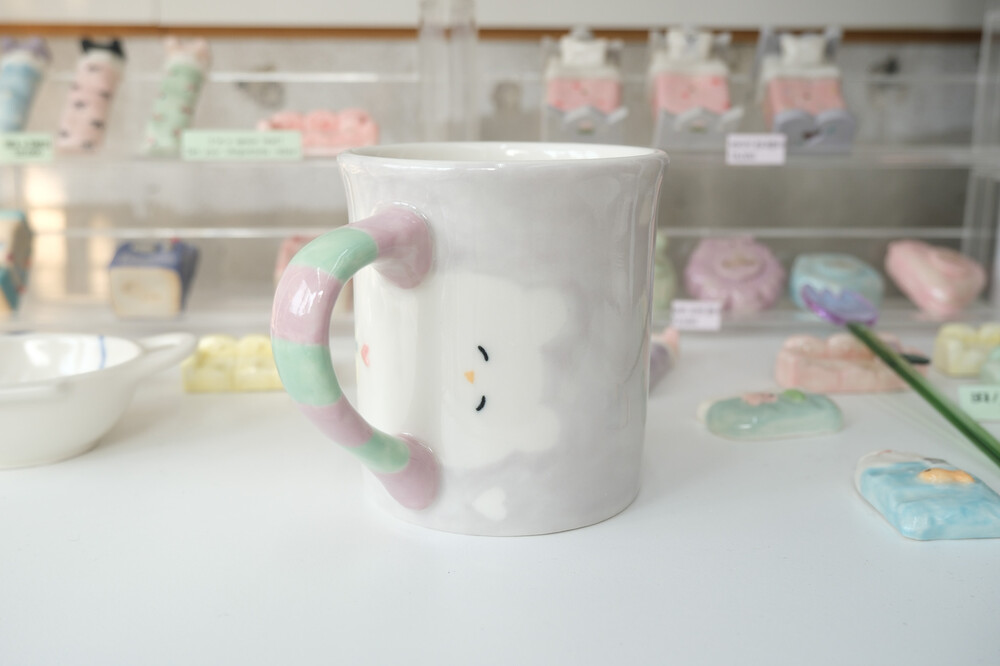 보라+민트 줄무늬 목도리를 맨 눈사람 곰돌이, 눈곰돌이 머그컵입니다 ꕤ
